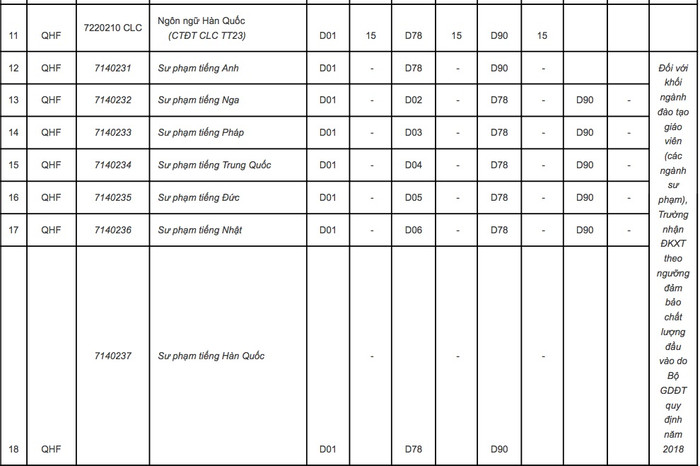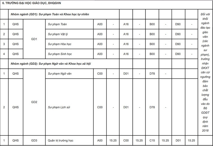 Đối với khối ngành đào tạo giáo viên (các ngành sư phạm), Trường nhận đăng ký xét tuyển căn cứ ngưỡng đảm bảo chất lượng đầu vào của Bộ Giáo dục và Đào tạo năm 2018.