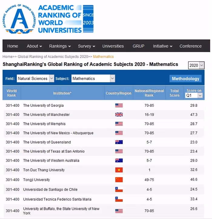 Trong bảng này, Nhóm ngành Toán (Mathematics) thuộc top 301-400 thế giới và số 1 Việt Nam. Đứng trên cả Đại học Georgia và Đại học Buffalo của Tiểu bang New York, Hoa Kỳ, Đại học Queensland của Úc về điểm Q1.