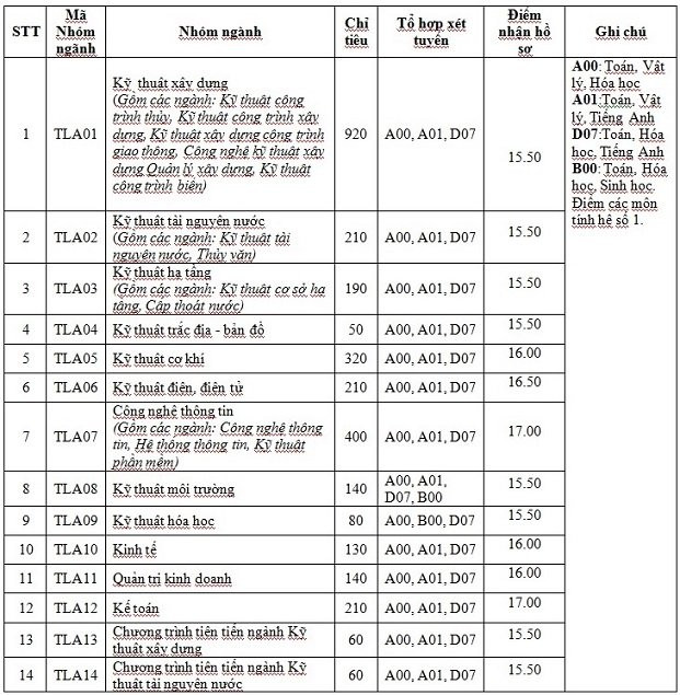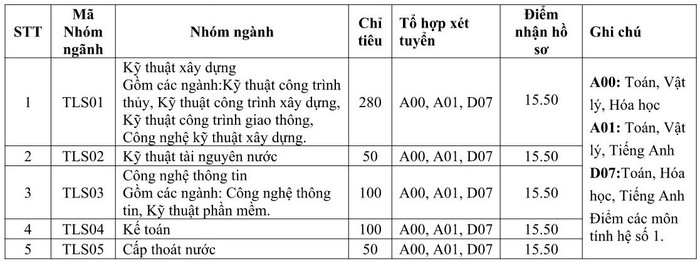 Trường Đại học Thủy lợi cho biết ngưỡng điểm nhận hồ sơ đăng ký xét tuyển đối với các tổ hợp môn xét tuyển vào các nhóm ngành đại học hệ chính quy năm 2017 từ 15,5.