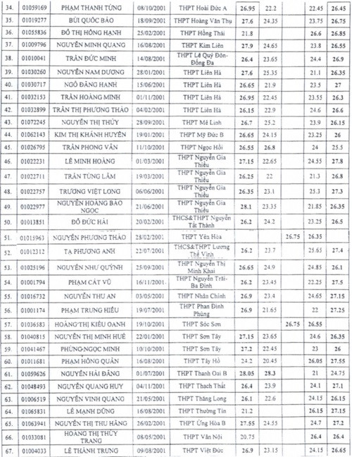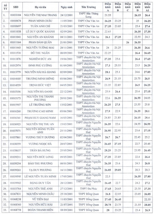 Danh sách các học sinh đạt điểm trên 26 tại Hà Nội: