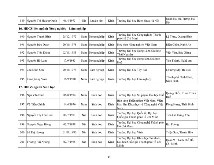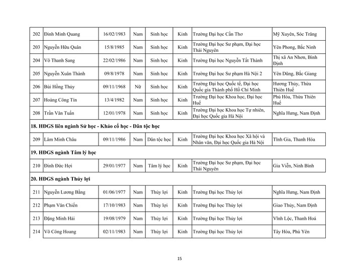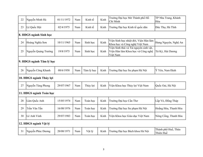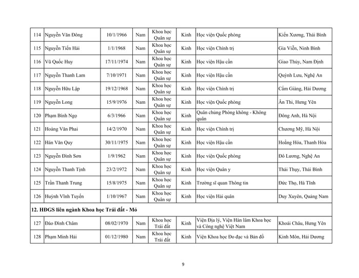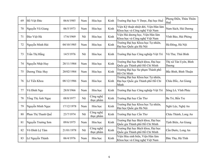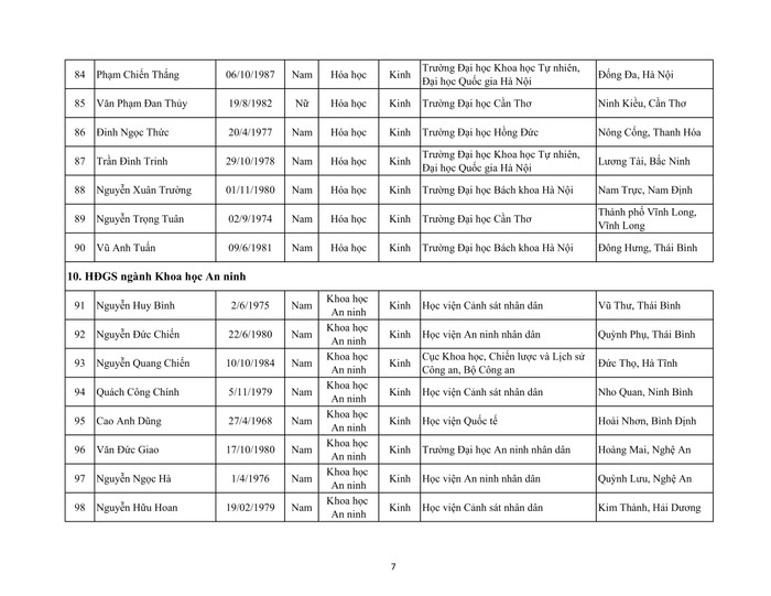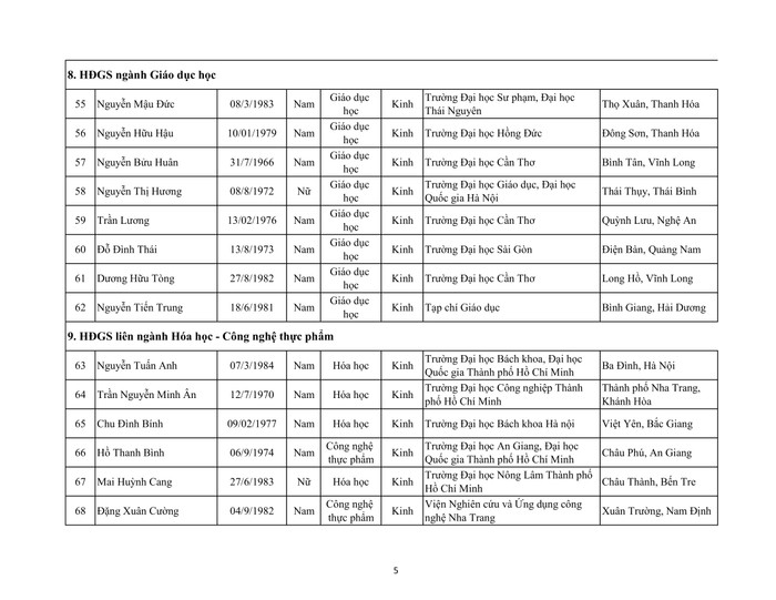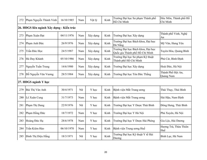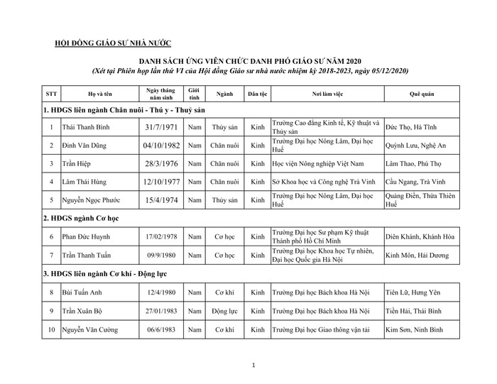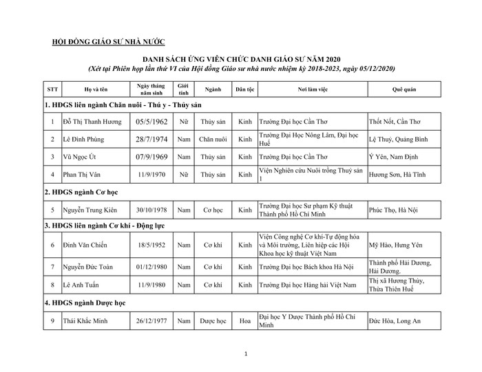 Đây là danh sách xét tại Phiên họp lần thứ VI của Hội đồng Giáo sư nhà nước nhiệm kỳ 2018-2023, ngày 05/12/2020. Danh sách cụ thể như sau: