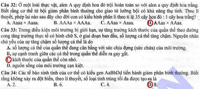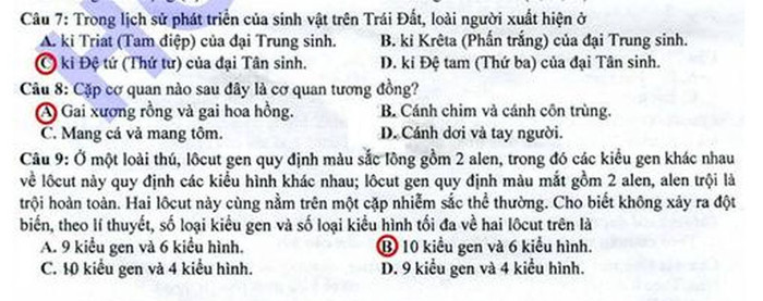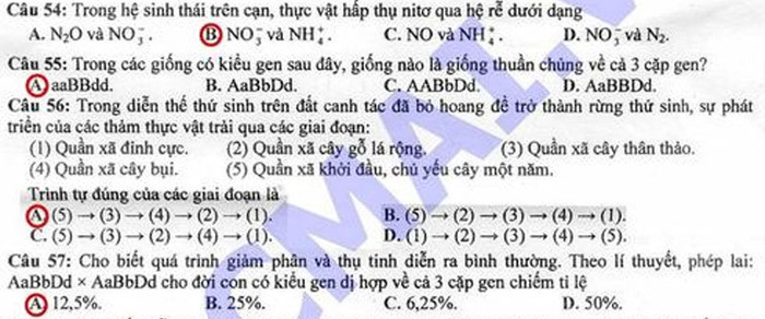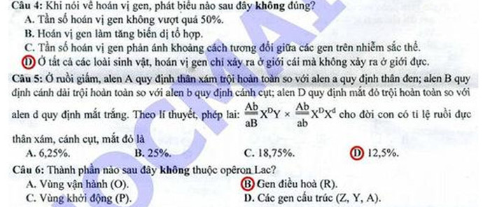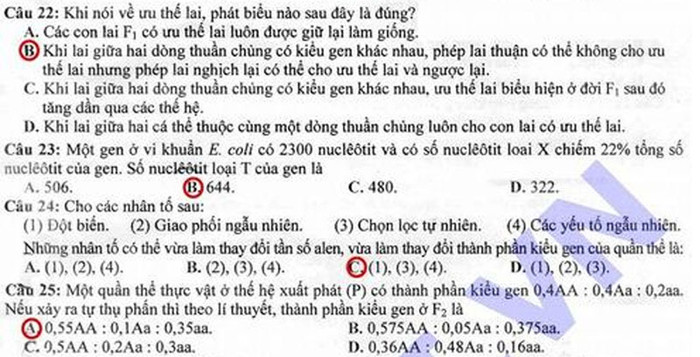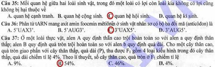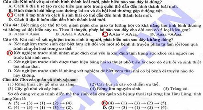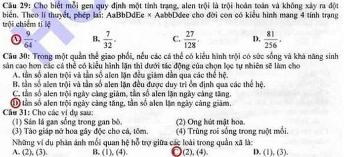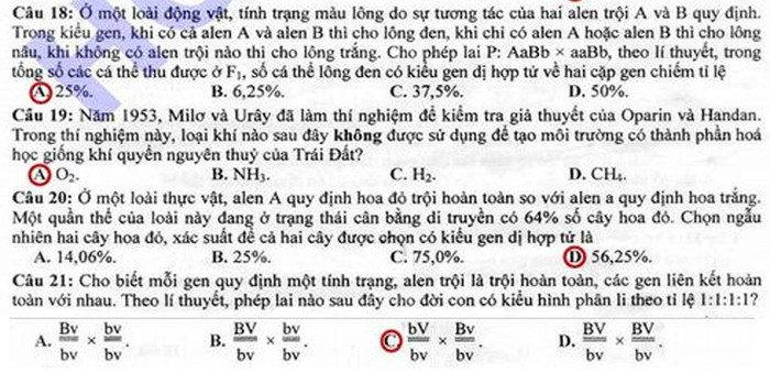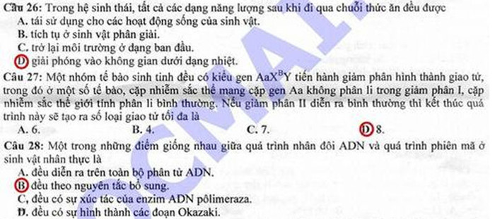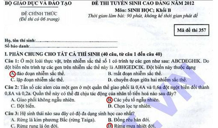 (GDVN) -Báo Giáo dục Việt Nam cập nhật đáp án đề thi Cao đẳng môn thi Sinh khối B năm 2012.