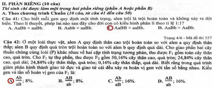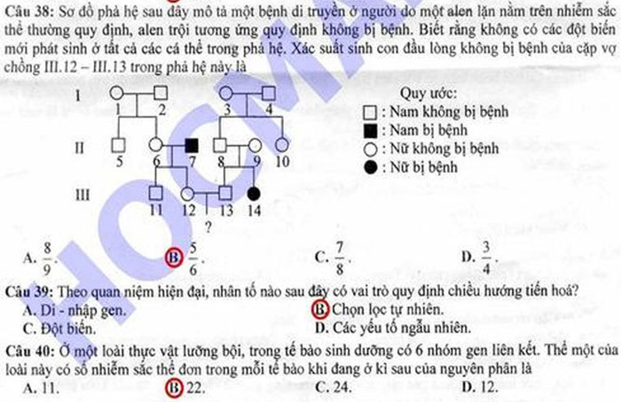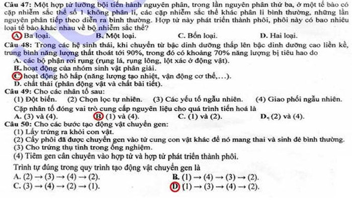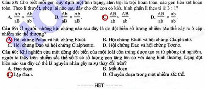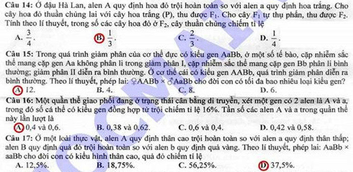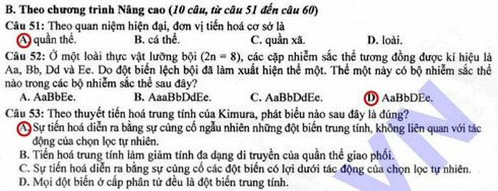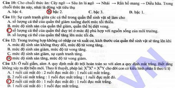 Đáp án đề thi Cao đẳng môn Sinh khối B năm 2012