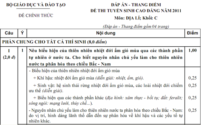 Đáp án đề thi tuyển sinh ĐH, CĐ năm 2011 (Địa lí)