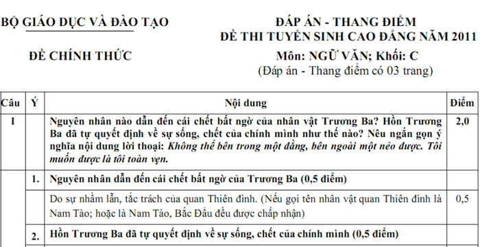 Đáp án đề thi tuyển sinh ĐH, CĐ năm 2011 (Môn Ngữ văn)