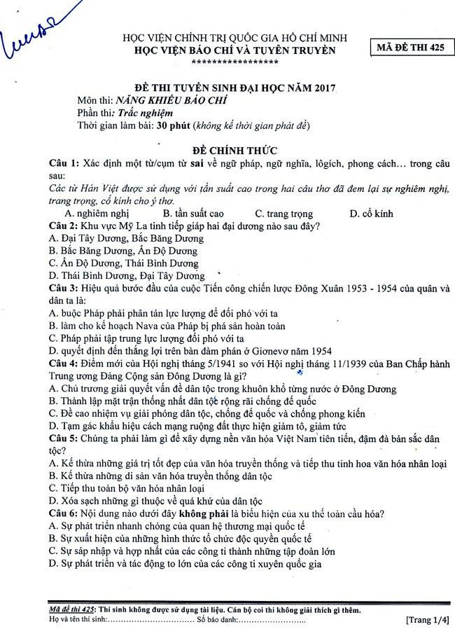 Dưới đây là đề thi Trắc nghiệm, môn thi Năng khiếu Báo chí vào Học viện Báo chí và Tuyên truyền năm 2017: