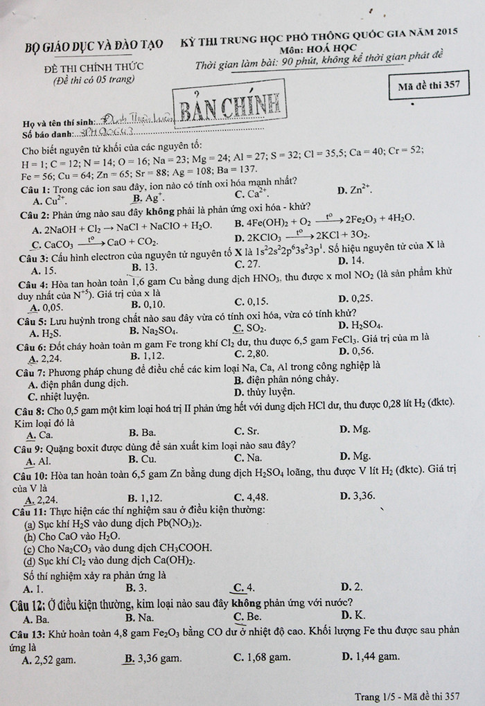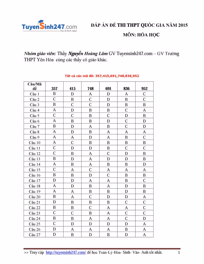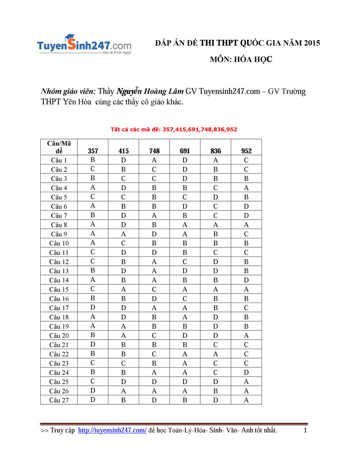 Nhằm đáp ứng nhu cầu của độc giả cũng như thí sinh trong Kỳ thi THPT Quốc gia năm 2015, Báo điện tử Giáo dục Việt Nam phối hợp với Tuyển sinh 247.com sẽ cập nhật liên tục và nhanh nhất lời giải, đáp án các môn thi trong Kỳ thi THPT quốc gia.
