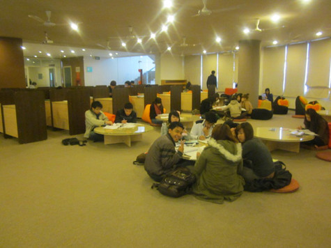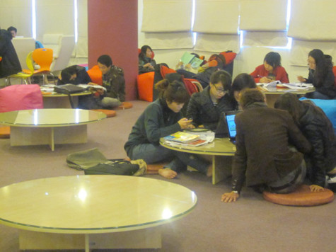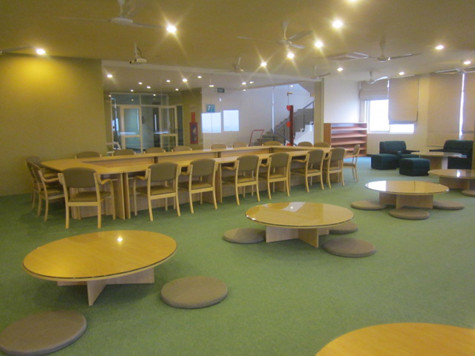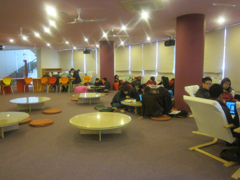 | Phong cách mới lạ của tầng 4 với tên gọi “My way My way” là những chiếc ghế tựa cách điệu, những chiếc ghế đệm êm, những chiếc bàn tròn có gối tựa lưng mang lại cảm giác thoải mái, bớt căng thẳng trong việc học |