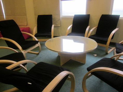 | Màu xanh vàng là tong màu chủ đạo của phòng học tầng 7, những chiếc cột to cũng là chỗ tựa lưng ấm áp, màu sắc hài hòa cũng những bộ ban ghế được thiết kế theo kiểu họp hội nghị, thích hợp cho những ai học theo nhóm, sôi nổi thảo luận |