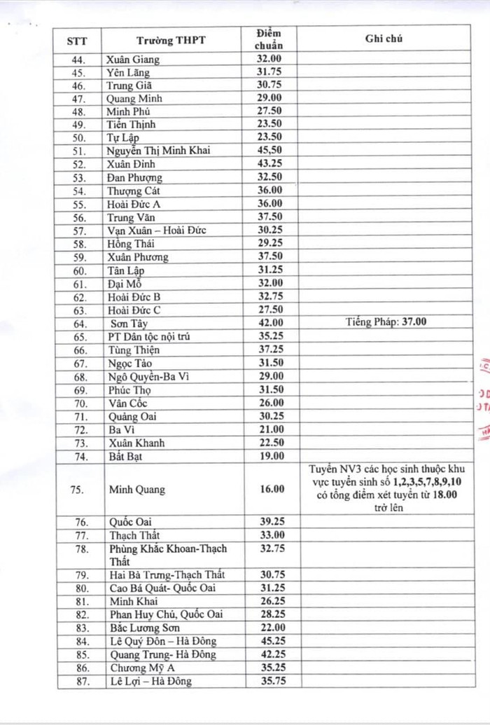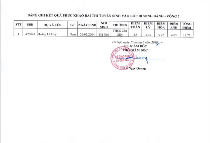 Ngoài ra, Sở Giáo dục và Đào tạo Hà Nội cũng công bố kết quả phúc khảo bài thi tuyển sinh lớp 10 song bằng - vòng 2 như sau: