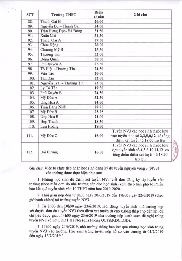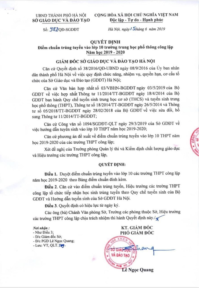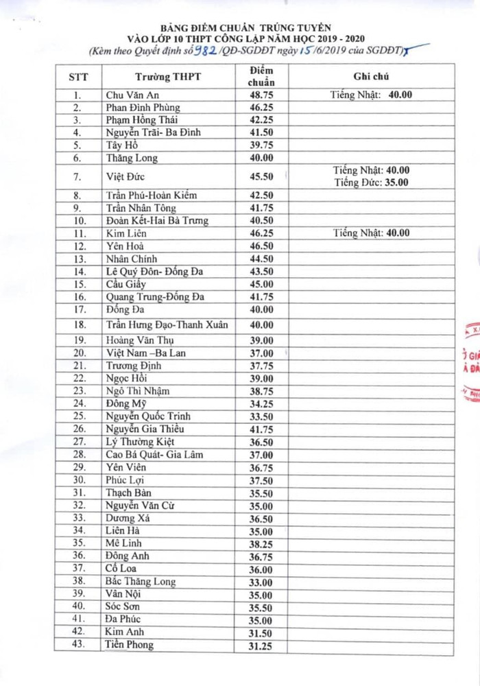 Điểm chuẩn vào lớp 10 của các trường trung học phổ thông công lập trên địa bàn Hà Nội như sau: