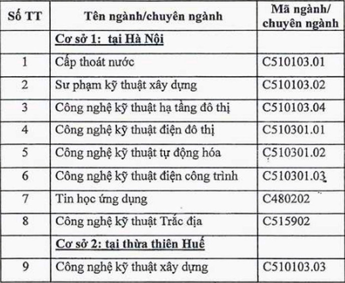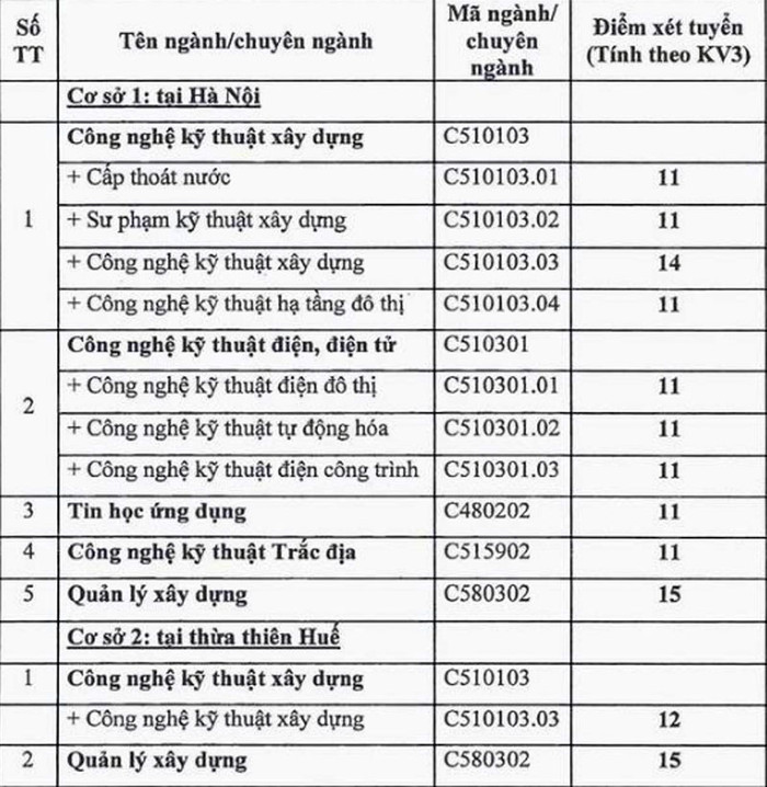 Thí sinh dự thi ngành Công nghệ kỹ thuật xây dựng (mã C510103.03) đạt từ 12 đến 13,5 điểm; ngành Quản lý xây dựng (mã C580302) đạt từ 12 đến 14,5 điểm được gọi nhập học và thí sinh được lựa chọn vào học một trong các ngành, chuyên ngành sau: