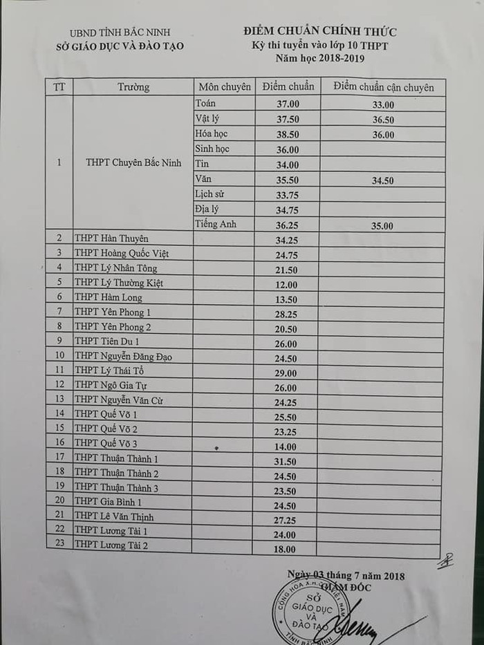 Theo đó, điểm chuẩn vào lớp 10 của trường chuyên, trung học phổ thông công lập trên địa bàn tỉnh Bắc Ninh vừa công bố như sau: