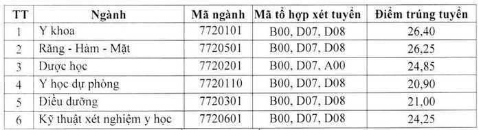 Trường Đại học Y - Dược có phổ điểm trúng tuyển khá cao, dao động từ 20,90 - 26,40. Ngành Y khoa lấy 26,40 điểm; Răng Hàm Mặt lấy 26,25 điểm; Dược học lấy 24,85 điểm; Kỹ thuật xét nghiệm y học có điểm chuẩn là 24,25; Điều dưỡng là 21,00 điểm và Y học dự phòng 20,90 điểm.