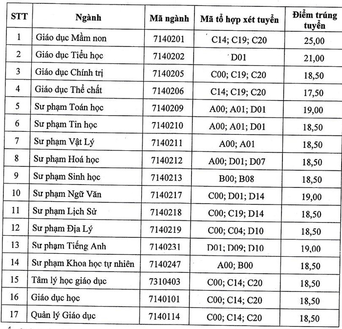 Trường Đại học Sư phạm có ngành Giáo dục mầm non có điểm trúng tuyển là 25,00 điểm; Giáo dục tiểu học là 21,00; các ngành Sư phạm Toán, Sư phạm Ngữ văn, Sư phạm Tiếng Anh có điểm trúng tuyển 19,00 điểm; Giáo dục thể chất: 17,50. Các ngành còn lại lấy 18,50 điểm.