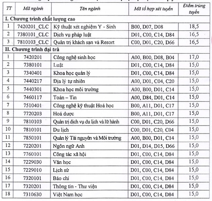Trường Đại học Khoa học có các chương trình trọng điểm định hướng chất lượng cao: Kỹ thuật xét nghiệm Y-sinh (thuộc ngành Công nghệ sinh học) lấy 18,50 điểm; Dịch vụ pháp luật (thuộc ngành Luật) lấy 16,50 điểm; Quản trị khách sạn và Resort (thuộc ngành Quản trị dịch vụ du lịch và lữ hành) lấy 16,50. Các ngành đại trà có ngành Công nghệ sinh học là 17,00 điểm; các ngành còn lại lấy 15,00 điểm.