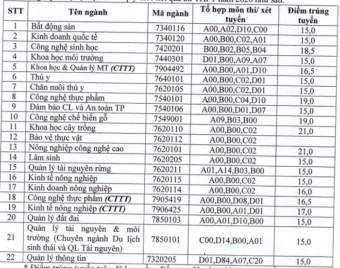 Trường Đại học Nông Lâm có ngành Nông nghiệp (chuyên ngành Nông nghiệp công nghệ cao), ngành Khoa học cây trồng: điểm chuẩn là 21,00 điểm; ngành Công nghệ thực phẩm, Công nghệ chế biến gỗ là 19,00 điểm; ngành Công nghệ sinh học là 18,50 điểm; ngành Kinh tế nông nghiệp (chương trình tiên tiến) là 17,00 điểm; ngành Công nghệ thực phẩm (chương trình tiên tiến) là 16,50 điểm; các ngành còn lại lấy 15,00 điểm.