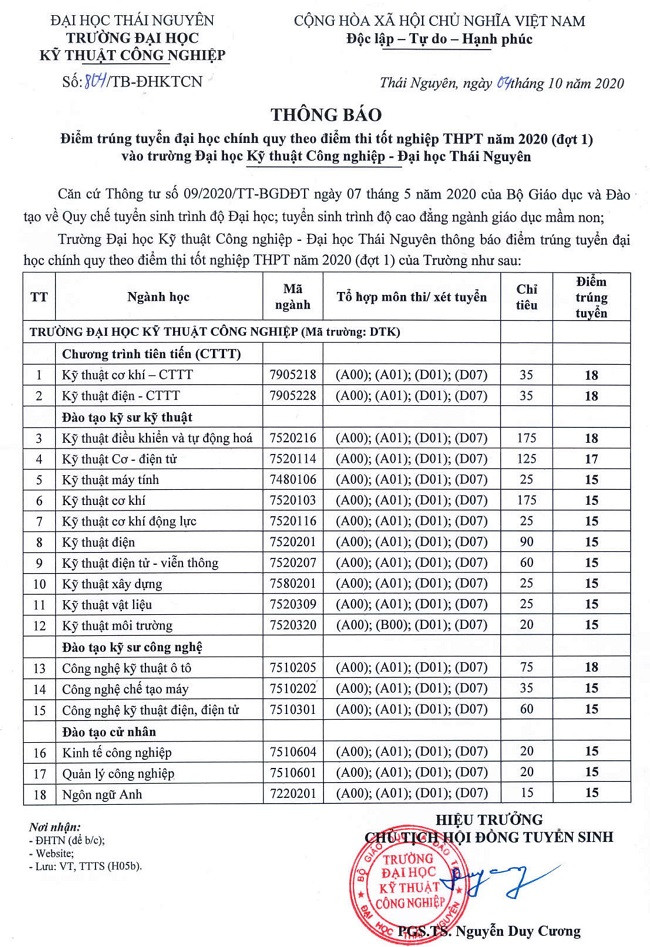 Trường Đại học Kỹ thuật Công nghiệp các ngành là Kỹ thuật cơ khí (chương trình tiên tiến), Kỹ thuật điện (chương trình tiên tiến), Công nghệ Kỹ thuật ô tô, Kỹ thuật điều khiển và tự động hoá có điểm chuẩn là 18,00 điểm. 9 ngành còn lại lấy 15,00 điểm.