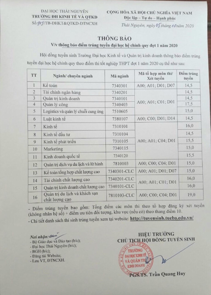 Trường Đại học Kinh tế và Quản trị Kinh doanh có ngành Quản trị dịch vụ du lịch và lữ hành (chuyên ngành Quản trị du lịch và khách sạn) có điểm trúng tuyển là 19,00; ngành Quản lý công điểm chuẩn là 17,50... Một số ngành có điểm trúng tuyển thấp nhất là 14,50 điểm.