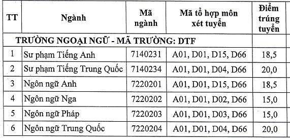 Trường Ngoại ngữ thuộc Đại học Thái Nguyên (ĐHTN) có hai ngành lấy 20,00 điểm là Sư phạm Tiếng Trung Quốc và Ngôn ngữ Trung Quốc (Gồm các chuyên ngành: Ngôn ngữ Trung Quốc, Song ngữ Trung-Anh, Song ngữ Trung-Hàn); hai ngành lấy 18,50 điểm đó là Sư phạm Tiếng Anh và Ngôn ngữ Anh (Gồm các chuyên ngành: Ngôn ngữ Anh, Song ngữ Anh-Hàn), 02 ngành còn lại là Ngôn ngữ Nga và Ngôn ngữ Pháp lấy 15,00 điểm (Điểm trúng tuyển tính theo thang điểm 30, đã bao gồm điểm ưu tiên khu vực và đối tượng (nếu có).