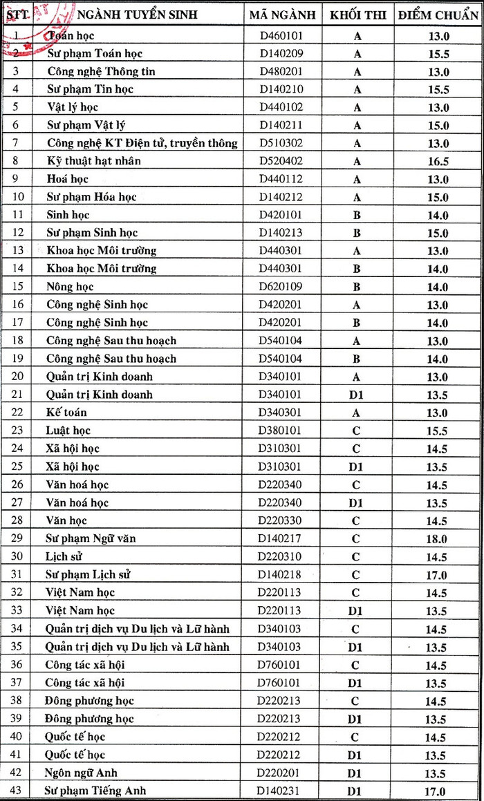 Điểm chuẩn khối A: 13,0; khối B: 14,0; khối C: 14,5; khối D1: 13,5 điểm (trừ các ngành: Sư phạm, Kỹ thuật hạt nhân và Luật).