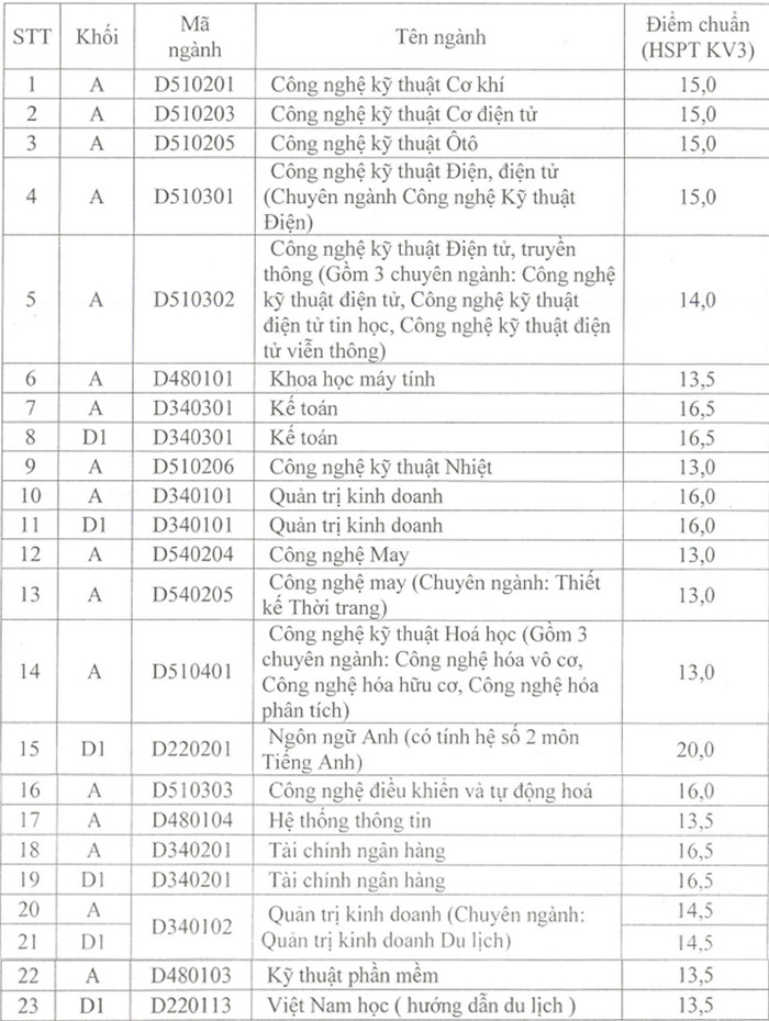Điểm chuẩn trúng tuyển NV1 trên tính cho đối tượng học sinh phổ thông, khu vực 3. Mức chênh lệch điểm trúng tuyển giữa hai nhóm đối tượng kế tiếp là 1,0 (một) điểm, giữa hai khu vực kế tiếp là 0,5 (nửa) điểm.