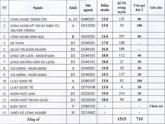 Điểm trên áp dụng với với thí sinh KV3. Mức chênh lệch điểm trúng tuyển giữa các nhóm đối tượng liền kề là 1 (một) điểm, khu vực liền kề là 0,5 (nửa) điểm.