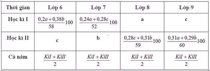 Để dễ hiểu, lấy ví dụ học sinh X, kiểm tra môn Hóa học đạt a điểm, Sinh học đạt b điểm, Vật lý đạt c điểm. Công thức tính điểm đánh giá của học sinh X sẽ thực hiện theo bảng sau: