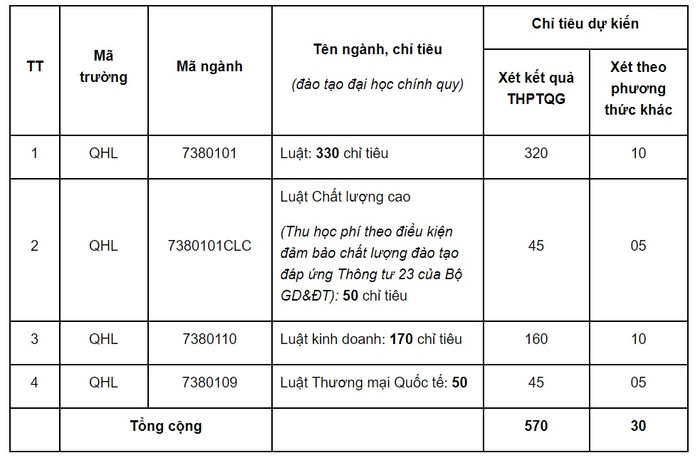 Theo đó, thí sinh có nguyện vọng trúng tuyển vào trường phải đạt mức tối thiểu 17 điểm đối với các ngành là Ngành Luật, Ngành Luật Kinh doanh, Ngành Luật Thương mại Quốc tế; 16,5 điểm đối với Ngành Luật chất lượng cao.