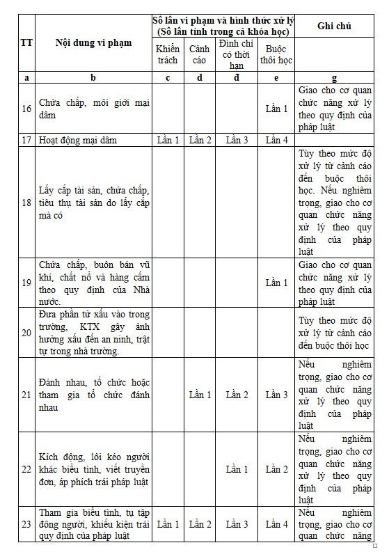 Còn nếu hoạt động chứa chấp, môi giới mại dâm sẽ chịu hình thức bị buộc thôi học ngay lần đầu tiên bị phát hiện vi phạm. Cùng đó bị giao cho cơ quan chức năng xử lý theo quy định của pháp luật.