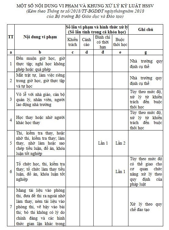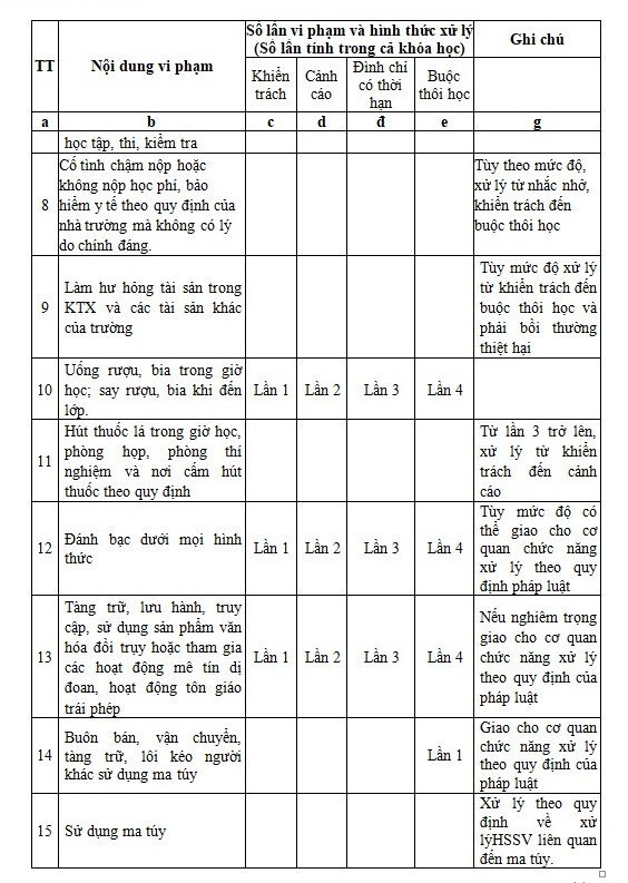 Dự thảo khung xử lý kỷ luật học sinh, sinh viên cũng cụ thể nhiều nội dung vi phạm với những hình thức xử lý tương xứng, căn cứ trên mức độ vi phạm và số lần tái phạm.
