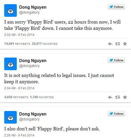 Trước đó, Vào lúc 2h sáng 9/2, Nguyễn Hà Đông bất ngờ viết trên Twitter: "22 giờ nữa, kể từ bây giờ, tôi sẽ hạ Flappy Bird xuống. Tôi không thể chịu nổi điều này nữa".