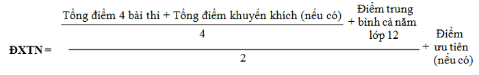 Điểm xét tốt nghiệp; gồm điểm 4 bài thi thí sinh đăng ký để xét công nhận tốt nghiệp, điểm ưu tiên, khuyến khích (nếu có) và điểm trung bình cả năm lớp 12; được tính theo công thức sau: