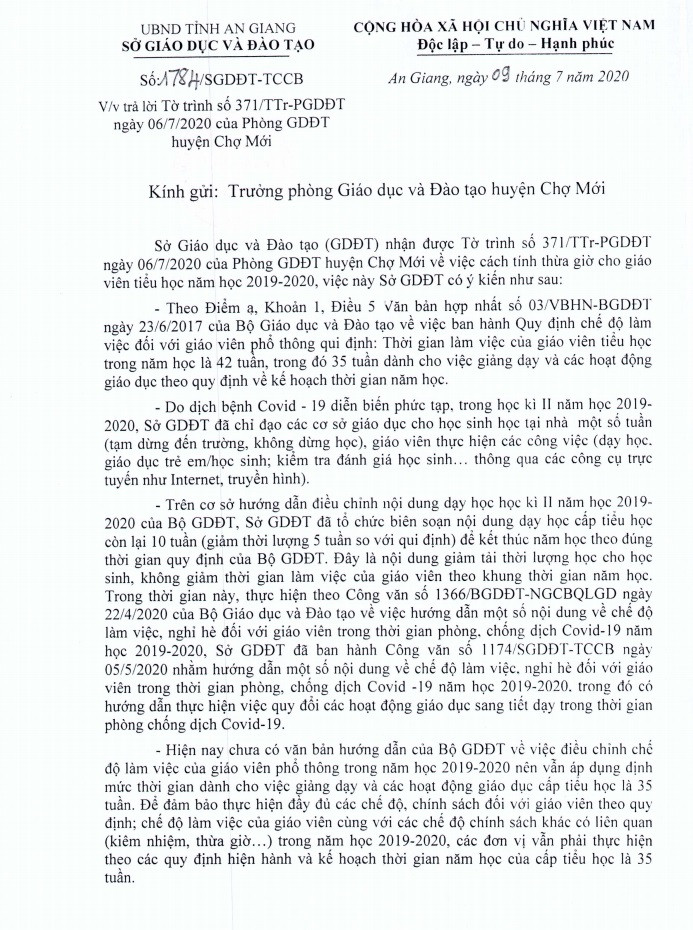Trong Công văn 1784/SGDĐT-TCCB trả lời đề nghị của Phòng Giáo dục huyện Chợ Mới về việc tính tiền phụ trội cho giáo viên, Sở Giáo dục và Đào tạo tỉnh An Giang cho biết: