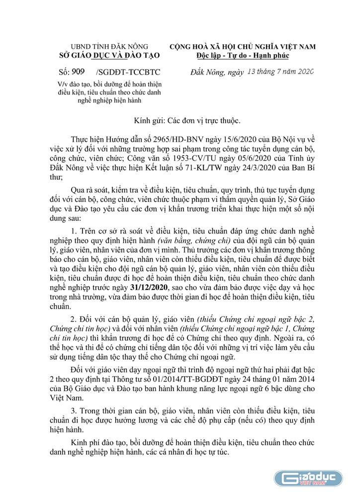 Ngày 13/7/2020 của Sở Giáo dục và Đào tạo tỉnh Đắk Nông Công văn số: 909/SGDĐT-TCCBTC về việc đào tạo, bồi dưỡng để hoàn thiện điều kiện, tiêu chuẩn theo chức danh nghề nghiệp hiện hành được nhà trường gửi qua email khiến họ đứng ngồi không yên.