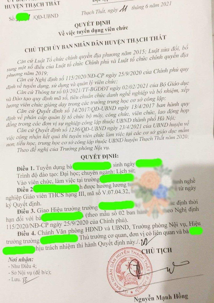 Cùng là đối tượng giáo viên đã có hợp đồng lao động và đóng bảo hiểm xã hội từ ngày 31/12/2015 trở về trước, có bằng cử nhân chuyên ngành phù hợp, có chứng chỉ nghiệp vụ sư phạm (cấp trước ngày 22/5/2021) nhưng giáo viên ở huyện Thạch Thất, thành phố Hà Nội vẫn được tuyển vào làm viên chức năm 2021. Quyết định được Ủy ban Nhân dân huyện Thạch Thất ký vào ngày 11 tháng 6 năm 2021.