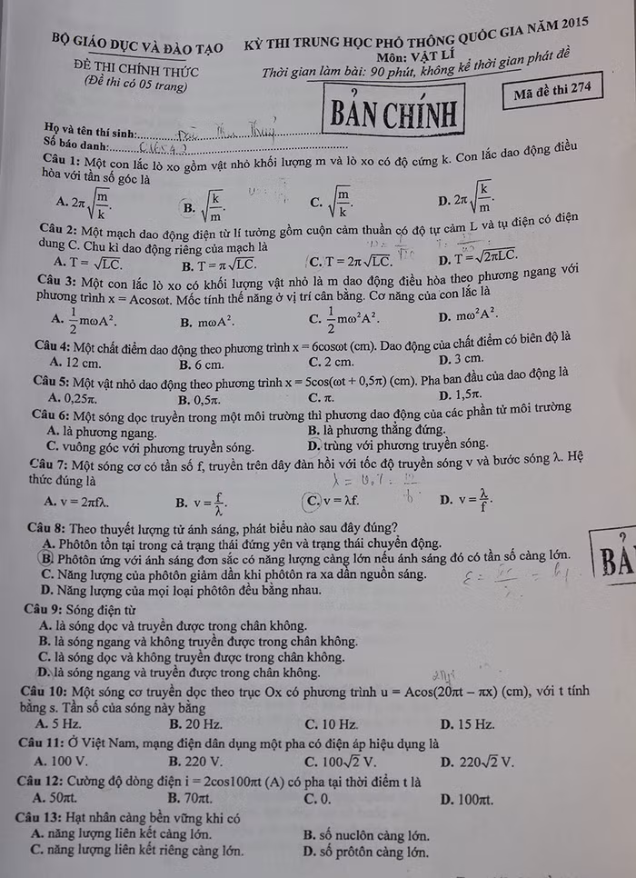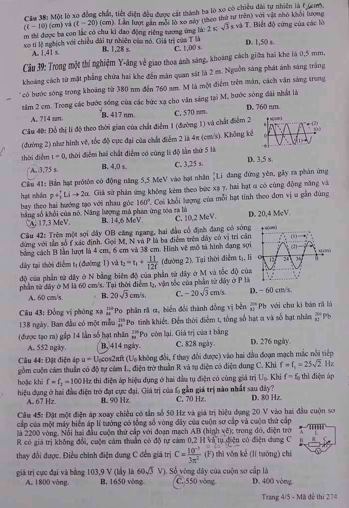 Mã đề Vật lý 274.