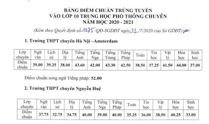 Theo đó, ngày 31/7, Sở Giáo dục và Đào tạo Hà Nội công bố điểm chuẩn vào lớp 10 của 4 trường chuyên trên địa bàn Hà Nội năm học 2020-2021.