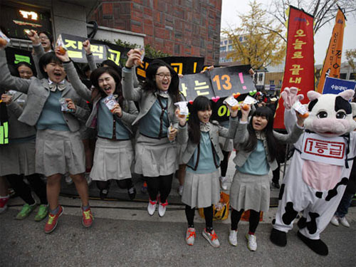 Trước các trường thi, một số nhóm học sinh trung học đã tập trung cổ vũ sĩ tử, tiếp sức cho họ bằng thức ăn nhẹ. Một học sinh trường trung học Junior tên là Kim Boo-seung cho hay: “Chúng em đã tập trung tại đây từ 10 giờ tối qua để chọn chỗ tốt nhất, đợi cả đêm để có thể cổ vũ tinh thần các anh chị với khẩu hiệu: “Tiến lên, các anh chị! Đạt kết quả thật cao nhé!”.