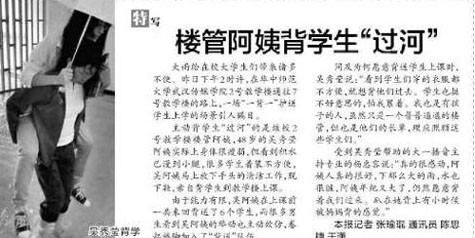Trước tình cảnh đó, cô lao công Ngô Tú Anh, 50 tuổi không ngần ngại cõng các sinh viên này vào lớp. Một giáo viên đã chụp ảnh và đưa lên mạng. Một loạt hình ảnh cho thấy nữ sinh viên đang giữ ô và sách khi được cô lao công cõng trên lưng.