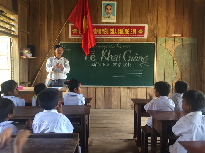| Vì địa hình hiểm trở, xa trung tâm nên các thầy giáo tự tổ chức lễ khai giảng cho học sinh. |