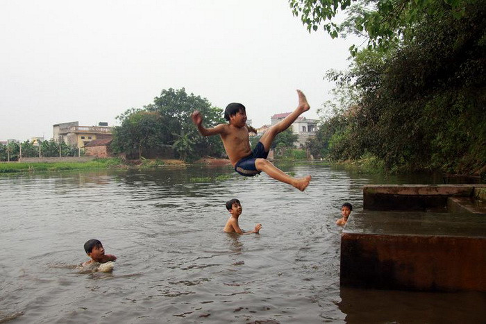| Trong khi ở thành phố được tắm ở bể bơi sạch sẽ, thì những đứa trẻ ở xã Ngọc Mỹ, huyện Quốc Oai chọn ra sông, hồ để giải tỏa nóng bức của mùa hè. Chúng đều ở độ tuổi 10 - 14 tuổi, hồn nhiên cười đùa nghịch ngợm dưới dòng nước mà không hề lo sợ, ngại ngùng khi có người chụp ảnh. |