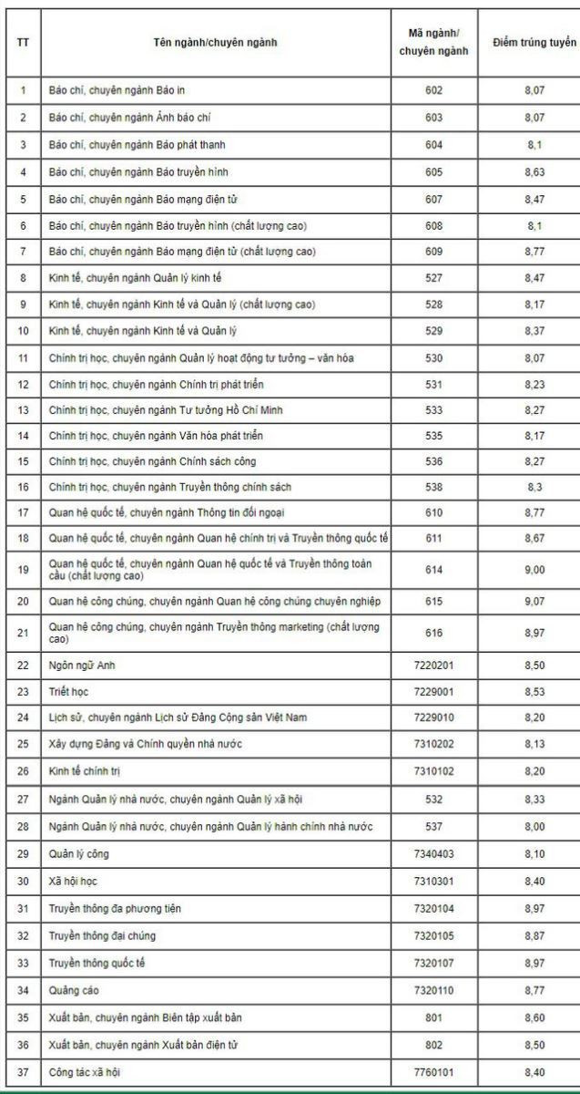 Điểm trúng tuyển đối với từng ngành/chuyên ngành cụ thể như sau: