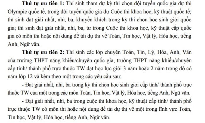 Cụ thể, đối với phương thức xét tuyển thẳng, trường xét tuyển thẳng thí sinh đạt giải quốc gia, quốc tế. Đối với phương thức xét tuyển thẳng học sinh giỏi ở bậc trung học phổ thông, trường xét tuyển theo 5 thứ tự ưu tiên: