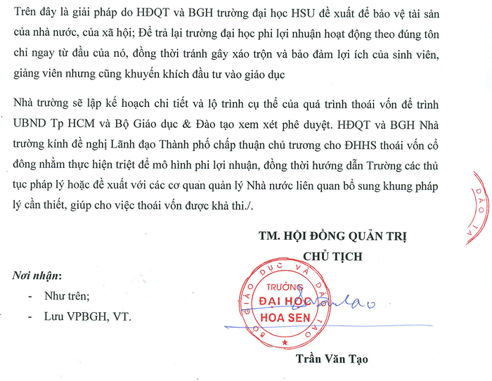 Theo công văn số 891 của HĐQT ĐHHS gửi Lãnh đạo Thành ủy Tp HCM và Ủy ban Nhân dân Tp HCM với tiêu đề nội dung “V/v thực hiện cơ chế phi lợi nhuận để bảo vệ tài sản của cộng đồng và Nhà nước tại ĐHHS”, do ông Trần Văn Tạo kí ngày 14/8/2014, thay mặt HĐQT, ông Tạo tóm tắt “Sau 2-3 năm biến HSU thành 1 đại học không có cổ đông" và buộc các cổ đông phải thoái vốn bằng cách sử dụng tài sản của trường mua lại cổ phiếu với giá trị được tính bằng công thức mà ông tự nghĩ ra.