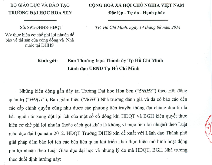 LTS: Tuần qua, báo Giáo dục Việt Nam đã nhận được đơn tố cáo và kêu cứu của cổ đông Trường ĐH Hoa Sen phản ánh việc Hội đồng quản trị (HĐQT) trường này xem thường sự hiện diện của các cổ đông và xem thường một số thành viên của HĐQT khi gửi công văn 891/ĐHHS-HĐQT đến các cơ quan quản lý Nhà Nước đề xuất mua lại cổ phần, ép buộc các cổ đông thoái vốn. Để rộng đường dư luận, chúng tôi đăng tải lá đơn này.