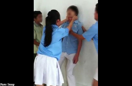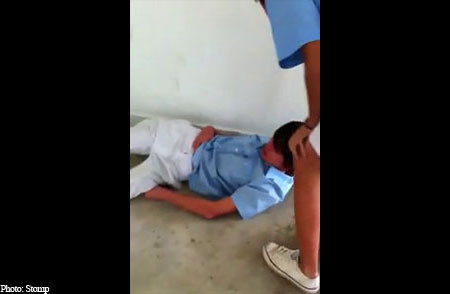 | Hình ảnh được một công dân mạng ghi được và đăng tải trên diễn đàn Stomp cho thấy rằng, hai học sinh nam đã bị các bạn học, bao gồm cả học sinh nữ ẹp lồng ngực và bóp cổ cho tới khi học sinh nam mất tỉnh táo và ngất xỉu. |