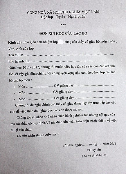 Còn về hình thức viết đơn xin học CLB, bà Hà cho biết, thực chất, của vấn đề này là việc dạy thêm ngoài nhà trường, nhưng có mượn cơ sở vật chất của trường.