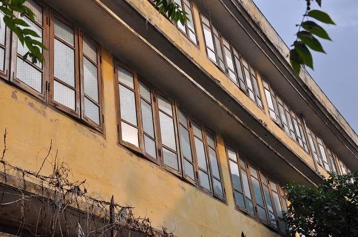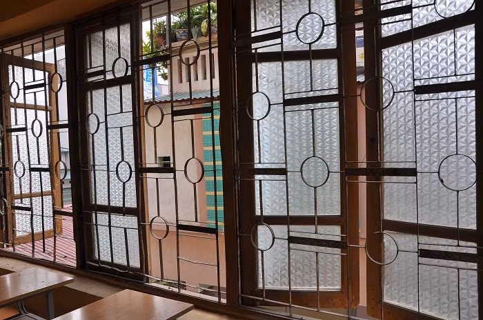 | Phần lớp các của kính phía sau trường - nơi giáp với nhà dân được dán giấy kính màu trong suốt trước ngày thi vào lớp 10. |