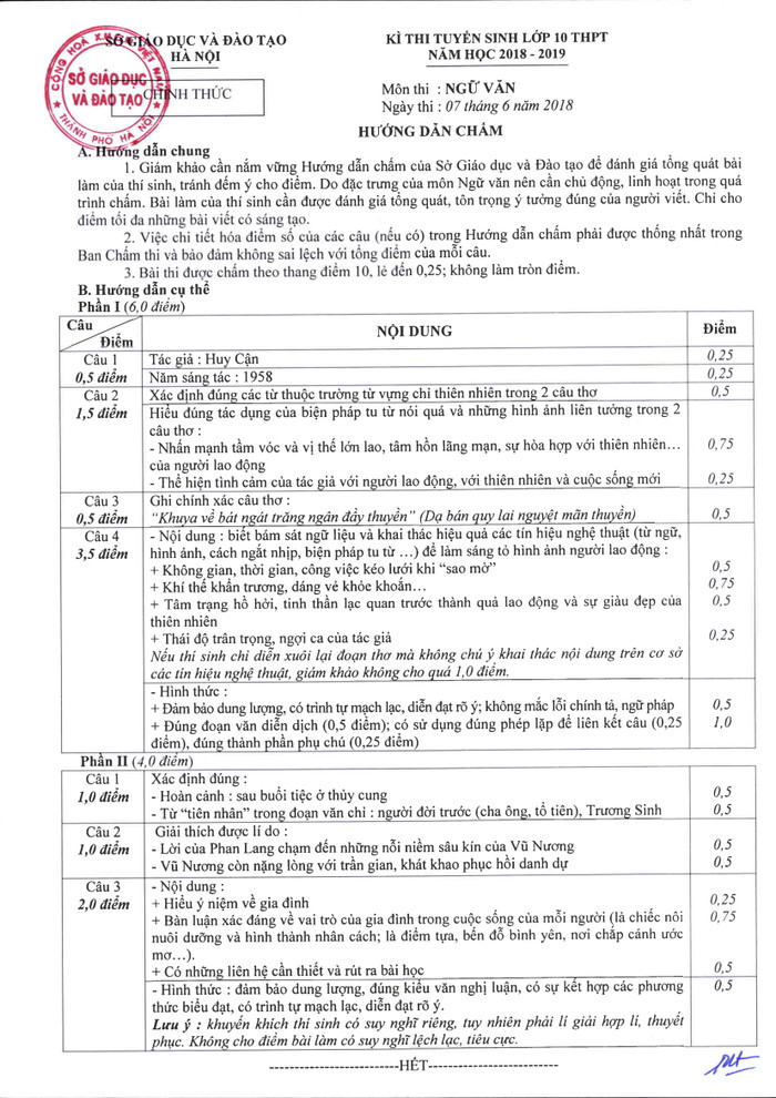 Chiều 12/6, Sở Giáo dục và Đào tạo Hà Nội công bố hướng dẫn chấm và thang điểm môn Ngữ văn.